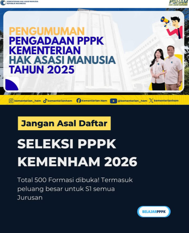 Seleksi PPPK Kementerian HAM 2026 membuka 500 formasi resmi dan menjadi kesempatan besar bagi WNI yang ingin berkarier di layanan publik dan penguatan HAM.
